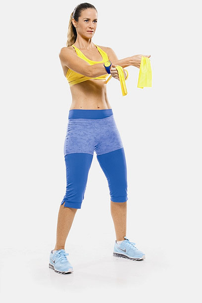 1. עמדי בפישוק ברוחב האגן, הברכיים כפופות מעט, הבטן אסופה והישבן מכווץ, ואחזי בגומייה מאחורי הגב.