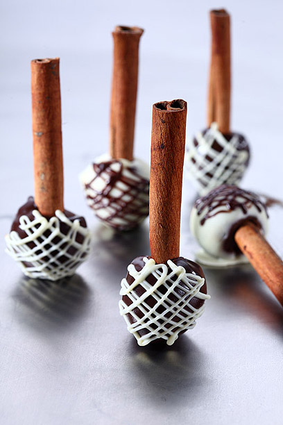 - יוצרים כדורים מהתערובת, ובמרכז כל כדור נועצים מקל קינמון. מקפיאים מספר שעות עד שהתערובת מתקשה לחלוטין.