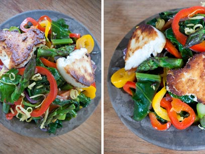 מנה של ירקות מוקפצים עם גבינת מאנורי צרובה בקראסט תבלינים - סלט מוקפץ בצבעים משמחים עם פרוסות גבינה מצופות בתערובת תבלינים. אם אתם מתקשים להשיג את המנורי, אפשר לחילופין להשתמש בגבינת חלומי. לארוחה קלה בצבעי העונה.