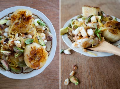 - בעזרת כף מזליפים מעל את הדבש, גרידת הלימון, עלי נענע ופיסטוקים ומגישים מיד.