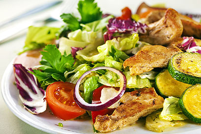 - מוסיפים לקערה עם החסה והכרוב את העוף, הבצל הסגול, הקישואים והעגבניות. מערבבים קלות, מוסיפים 2 כפות שמן זית ומערבבים שוב.