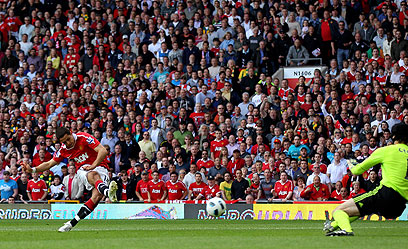 23': גול! 0:2 למנצ'סטר יונייטד. ראיין גיגס הגביה מצד שמאל, נמניה וידיץ' נגח מקרוב לרשת.