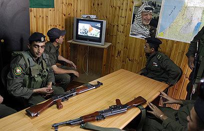 שוטרים פלסטיניים צופים בהסכם הפיוס (צילום: AP)