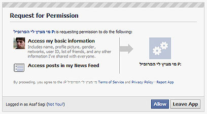 שולח מפתח רזרבי למפרסמים. חלון האישור של אפליקציות פייסבוק