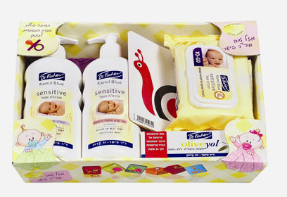 ד"ר פישר מציע ערכת מתנה ליולדת עם מגוון תכשירים לרך הנולד. הערכה כוללת: משחת אוליביול לטיפול בתפרחת חיתולים, תכשירי סדרת קמיל בלו סנסיטיב שיבולת שועל, מגבונים, אל-סבון ותחליב גוף וספרון התפתחות לתינוק. מחיר: 60 שקל. להשיג ברשתות הפארם.