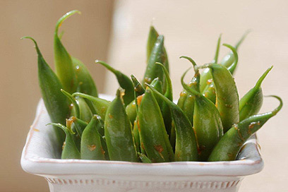 איך קונים שעועית ירוקה טרייה וצעירה? קודם כל הצבע שלה צריך להיות ירוק בהיר, חי, חזק, כזה שמזכיר שדה אחרי הגשם. התרמיל צריך להיות מוצק ולא רופס, כזה שנשבר בקלות ומשמיע קול קטן וחד בנקודת השבירה. אם נוגסים בתרמיל הלא מבושל הוא נשבר ומתפצפץ בפה, חורק בטריותו בין השיניים ואין בו סיבים שקשה ללעוס.