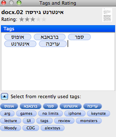 מערכת OS X כוללת אפשרות תיוג ומעקב אחרי תגיות - ממש כמו בפייסבוק. אם, לדוגמה, צילמתם את הילדים בערב ל”ג בעומר, התמונה ייובאה מהמצלמה עם השם סקסי "DS13245". יכול להיות גם ששינתם את שם התמונה ל"ערב ל"ג בעומר 2011" - אבל בשני המקרים מציגים לעולם לא תמצאו אותה לפי השם.