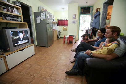 צופים בנאום נתניהו בבית משפחת זרביב בנווה צוף (צילום: גיל יוחנן)