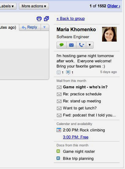 בשבועיים הקרובים ימוקם ווידג'ט האנשים החדש מימין לתצוגת המייל. בעזרתו, תוכלו לצפות בכל ההתקשרויות שהיו לכם עם אנשי קשר - מיילים, התכתבויות מגוגל Talk, מסמכי גוגל Docs ועוד. זה יכול להיות שימושי מאוד, במיוחד עבור מי שמרבה להשתמש בשירותי גוגל ורוצה למצוא במהירות מסמך ששיתף עם אחד מאנשי הקשר שלו.