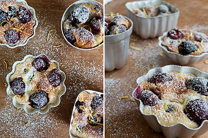 - מניחים בתוך כל תבנית 4-5 דובדבנים ויוצקים מעליהם את הבלילה. אופים בתנור כ-20 דקות, עד שהקלאפוטי תפח והקצוות שלו קיבלו גוון שזוף. יש להקפיד שלא לפתוח את דלת התנור לפני סיום האפייה, אחרת הקלאפוטי עלול לקרוס.