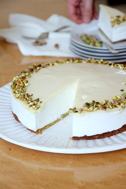 - מוציאים את העוגה מהתבנית ומקשטים במעט פיסטוק קלוי קצוץ גס.
