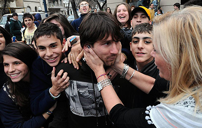 מסי מוקף במעריצים בצאתו מהמסעדה (AP)