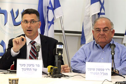 גדעון סער ומנכ"ל משרדו. כבר לא חייך (צילום: עופר עמרם)