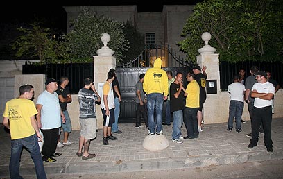 אוהדי בית"ר מפגינים מול ביתו של ארקדי גאידמק (צילום: טל שחר)