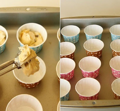 אחרי שהוספנו לבלילה גם את הביצים, החומרים היבשים ותוספת השוקולד צ'יפס, בעזרת כף קפיצית לגלידה מחלקים את הבלילה באופן שווה בין עטרות הנייר ואופים.