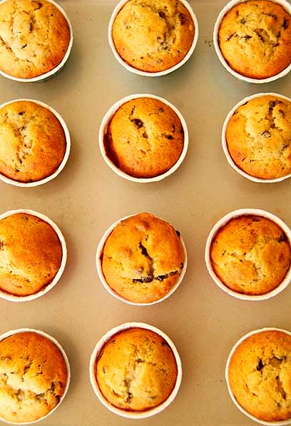 - בעזרת כף קפיצית לגלידה (או כף רגילה) מחלקים באופן שווה את הבלילה בין השקעים. ממלאים כל שקע עד ל-2/3 מגובהו. אופים כ-18-20 דקות או עד שהעוגות תפוחות וזהובות (השתדלו מאוד להימנע מאפיית יתר שמייבשת את העוגות).