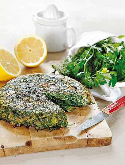 חביתה תפוחה וירוקה, חביתת הדגל של המטבח הפרסי. לפני ההגשה סוחטים מעל לימון ומגישים עם לחם טרי.