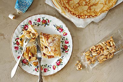 - למילוי הקרפ: פורסים קרפ על משטח עבודה, מניחים במרכז פרוסות מבננה אחת, מניחים מעל 2 כפות חלב מרוכז, כף גדושה שביבי קוקוס ו-2 כפות בוטנים מסוכרים. סוגרים בצורת מעטפה. ממלאים באותו אופן את כל הקרפים.