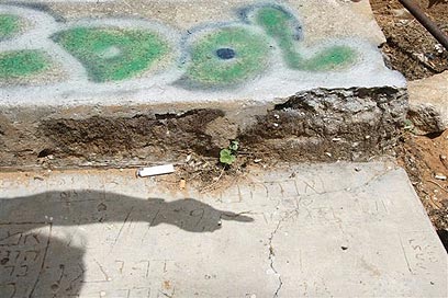 קרמן מצביע על כתובת שמו, שחקק על מדרגת בית הקולנוע "אוריון"