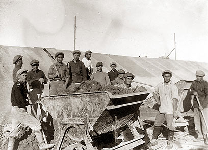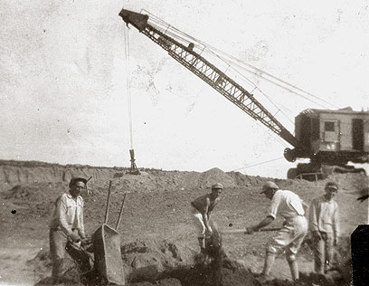 9-7. פרנסה נמצאה לחברי השומר הצעיר כאשר החל פנחס רוטנברג להקים את מפעל החשמל בנהריים. הבחורים התגייסו לעבודת החפירה, הבניין והרחבת אפיק הירדן, 1928.
