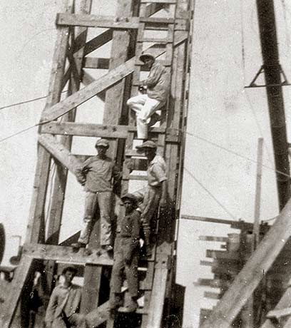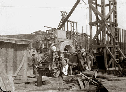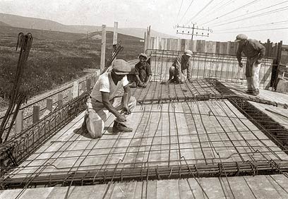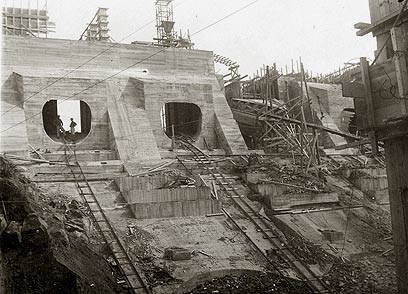 11-10. המפעל בנהריים היה גדול יציקות-הבטון בראשית שנות ה-30 בא"י. לא היו אז משאבות בטון ולצורך יציקות גבוהות בנו פיגום גבוה.