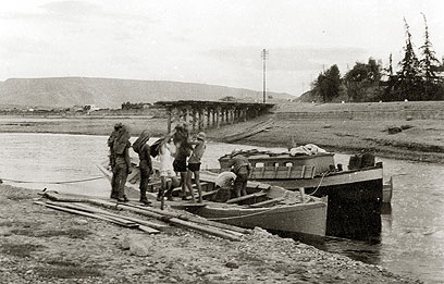 18. הבריטים בנו גשר כלונסאות מעל הירדן במקום שבו הירדן יוצא מהכנרת. הגשר היה פעיל מספר שנים עד שהוקם הגשר עליו נוסעים היום, באותן שנים שהוקם המפעל בנהריים. בתצלום נראה חלק של גשר הכלונסאות. אין בתצלום תאריך ולכן לא ברור אם הגשר נמצא בבנייה או בפירוק.