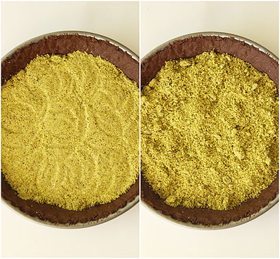 - יוצקים את מלית השוקולד על גבי מלית הפיסטוק ומיישרים את פני המלית.