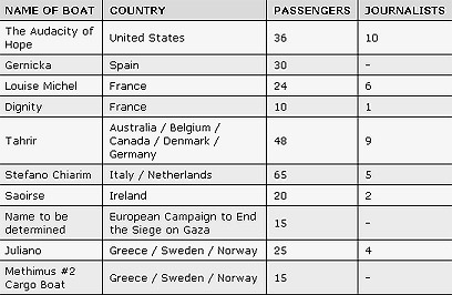 על-פי המסמך, הספינה האיטלקית "Stefano Chiarim" עתידה להכיל 65 בני אדם - מספר הנוסעים הגדול ביותר. האונייה הקנדית העונה לשם "תחריר" תכיל 48 נוסעים, ואילו האונייה האמריקנית "תעוזת התקווה", שמעוכבת לעת עתה על ידי שלטונות יוון, אמורה להכיל 40 נוסעים. בנוסף, צפויות לצאת לדרך עוד שבע ספינות מספרד, צרפת, אירלנד, שבדיה, יוון, ונורבגיה. על פי תסריט אופטימי של המארגנים, יעלו על סיפון הספינות 292 נוסעים ולצידם 36 עיתונאים. למרות זאת, קיימת סבירות גבוהה שלא כל כלי השיט יהיו כשירים לקראת המשט. בנוסף, מניעת אישור הפלגה מממשלת יוון עשוי להקטין עוד יותר את מספר המשתתפים.