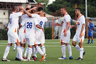 שחקני ראשל"צ חוגגים מול בני יהודה (צילום: עוז מועלם)