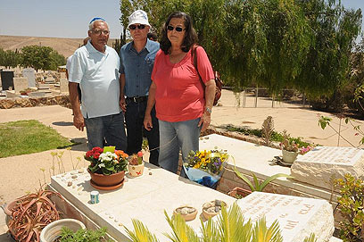 שליט והוריו של חנן ליד קברו. "באים כל שנה" (צילום: הרצל יוסף)