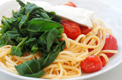- מחלקים את הפסטה עם העגבניות לקעריות אישיות. מניחים מעל כל ערימת פסטה חופן של עלי תרד מאודים ולצידם כמה פרוסות של ריקוטה. מזלפים על הכל שמן זית בנדיבות ומגישים חם.