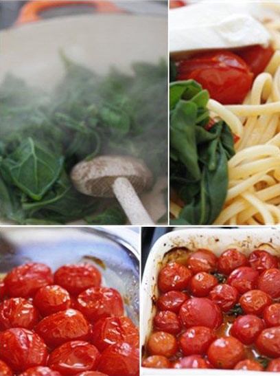 פסטה עם עגבניות צלויות, תרד מאודה וריקוטה