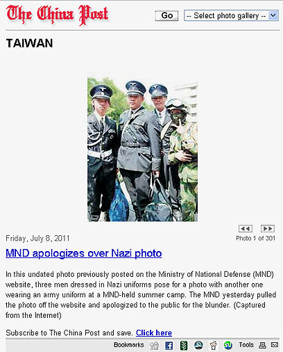 תקרית דיפלומטית מביכה מאוד ביחסי ישראל-טייוואן: בסוף השבוע האחרון הועלתה לאתר של משרד הביטחון הטייוואני תמונות של צעירים במדי קצינים של הצבא הנאצי. בעקבות זאת, התעוררה במדינה סערה תקשורתית ולאחר שהנציגות הישראלית בטייפה פנתה לשר הביטחון המקומי, הוסרה התמונה מהאתר.