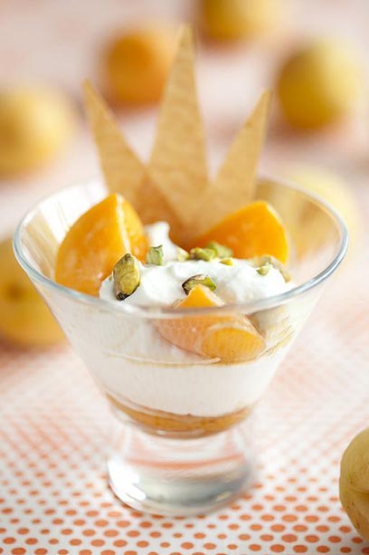 - הרכבה: מניחים כמה משמשים צלויים בכוס הגשה, שמים מעל 2 כפות מקרם המסקרפונה. מניחים עוד כמה משמשים ומעט מהקרם. נועצים 2 משולשים של פילו בקרם, ומעטרים במעט פיסטוקים קלויים.