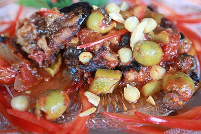 - מוסיפים את גרגרי החומוס, הזיתים והחצילים, מתבלים בפלפל שחור ופפריקה ומוסיפים את מיץ הלימון, מבשלים עוד 2 דקות יחד ומעבירים לצלחת הגשה. מעטרים בפרוסות שקדים