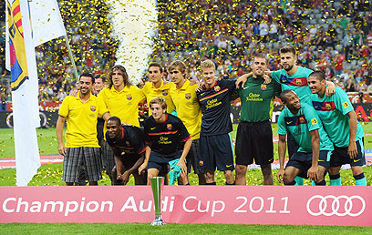 שחקני בארסה התרגלו להחזיק גביעים (AFP)