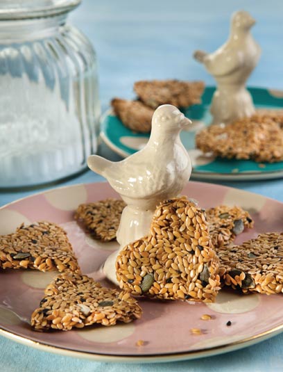 הקרקרים הטעימים של דגנית אמיתי מ"ניצת הדובדבן" לא מכילים שמן, ביצים או קמח. הסוד הוא הפשתן, שמכיל חומר דביק שמשתחרר במגע עם מים ו"מדביק" את כל החומרים. דגנית אוהבת להשתמש בחותכן עוגיות בצורת לב בקוטר 5 ס"מ, אך ניתן להשתמש בכל צורה שרוצים או פשוט לחתוך עם סכין למרובעים.