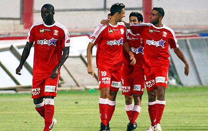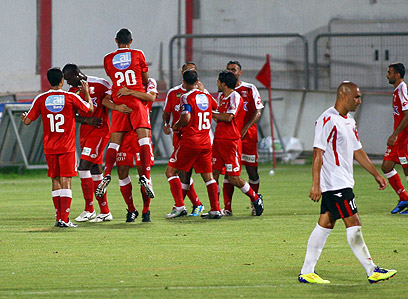 אזארוב והחברים בסכנין אחרי השער הראשון (צילום: גיל נחושתן)