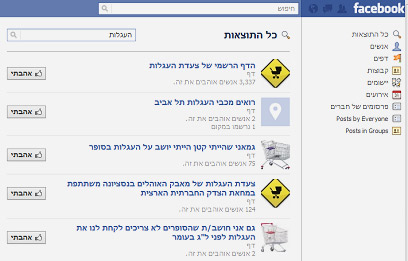 אז מגיעים לפייסבוק ופה מתחילה בעיה. אם אתם סרבני פייסבוק - כל העמודים חסומים בפניכם. אם אתם רשומים לרשת החברתית, אתם עשויים קצת לאבד את הידיים והרגליים. הגולשת ל', אם לילד שרצתה להשתתף בצעדת העגלות, סיפרה שחיפשה את המילה "העגלות" בפייסבוק. אם תעשו את זה תקבלו עמודים על מחאת העגלות, צעדת העגלות, הפגנת העגלות, קבוצות על ילדים שלוקחים עגלות מהסופר לל"ג בעומר. כך גם אם תחפשו את המילה "אוהלים" או את הסיסמה "ב' זה אוהל" שמניבה תוצאות לפי ערים שונות בארץ.