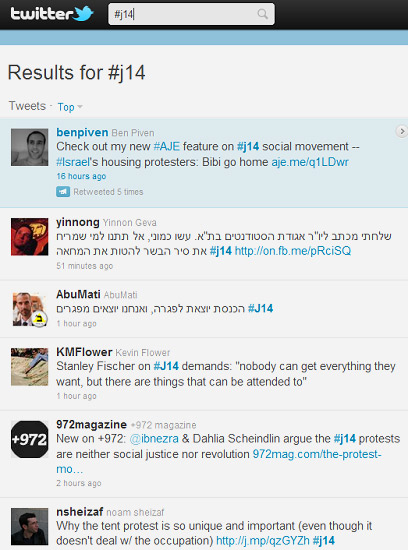 ראשית - קול העם. רבים מהגולשים שמגיבים על המחאה ברשת, בארץ ובעולם, משתמשים בתגית #j14 - על שם 14.7 התאריך שבו החלה מחאת האוהלים. אתם לא חייבים להיות חלק מטוויטר, או לדעת מה זה טוויטר בשביל להיכנס ולקרוא. פשוט להקליק על הלינק. אם בכל זאת אתם בטוויטר - פשוט רשמו #j14 בסוף כל ציוץ שנוגע למחאה, ותצטרפו לשיחה.