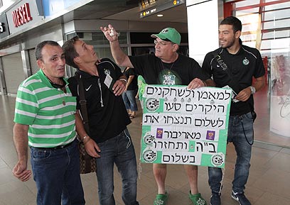 אוהד מכבי חיפה, ג'ורג' ואסילי הגיע לנתב"ג הבוקר עם שלט תמיכה בשחקנים, זר פרחים לרכש הטרי, חן עזריאל ושיני שום אותם העביר מעל ראשי השחקנים