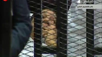 מובארק בתוך הכלוב בבית המשפט בקהיר (צילום: הטלוויזיה המצרית)