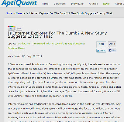 איפה זה התחיל? בשבוע שעבר פורסמה הודעה לעיתונות באתר בשם aptiquant שמשתמשי אקספלורר הם טיפשים, ושהמידע הזה מבוסס על מחקר (במקור Study). בהודעה נכתב שהחברה שמייעצת בתחום הפסיכומטרי ערכה מבדקי IQ מקוונים ל-100,000 איש. מי שמבדק מקוון כזה לא נשמע לו כמו דבר שאינו מדויק או מדעי יכול להמשיך ולקרוא ש"התוצאות לא מפתיעות" את החברה ושמשתמשי הדפדפן אקפסלורר קיבלו ניקוד נמוך יותר במבחן ממשתמשים של דפדפנים אחרים כמו כרום, פיירפוקס וספארי. יום לאחר מכן החברה פירסמה הודעה שבעקבות המחר שלה משתמשי אקספלורר שאותם כינתה טיפשים תובעים אותה.