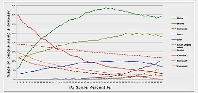 אגב תוצאות של גולשים מתחת לגיל 16 לא נכללו במחקר על פי הקובץ הצבעוני עם הגרפים. איך בדקו בני כמה הגולשים? ביקשו מהם לשים את הגיל בטופס. כן, אנשים יכולים לשקר, להתחזות, לערוך את המבחנים בקבוצות, לעשות את המבחן עשרות פעמים או סתם לאכול בננה מול המחשב כשאין עליהם בקרה. אבל זה PDF! והוא צבעוני! ולא סתם צבעוני - יש בו גרפים. הגרף השני אפילו צבעוני במיוחד ויש בו קווים עקומים. אם קווים עקומים אלה לא משכנעים שמשתמשי אקפסלורר הם טיפשים, מדע הסטטיסטיקה כנאה באמת כשל בתפקידו.