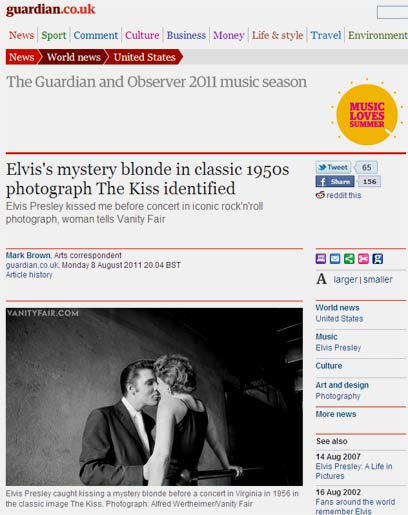 התמונה, שידועה בשמה "הנשיקה", היא הפריט המפורסם ביותר בסדרת תמונות של אלפרד ורטהיימר, צלם שאחראי לכמה מהפריימים האייקוניים ביותר של אלביס. הצילום ידוע כל כך, עד שהוא מככב באופן תדיר בתערוכות ובמיצגי אמנות ברחבי העולם. בשנה שעברה הוא הועמד במרכז התערוכה "אלביס בגיל 21", שהועלתה במוזיאון הסמיתסוניאן בוושינגטון, והשחקנית דיאן קיטון הגדירה אותו כ"תמונה הסקסית ביותר שצולמה אי פעם".