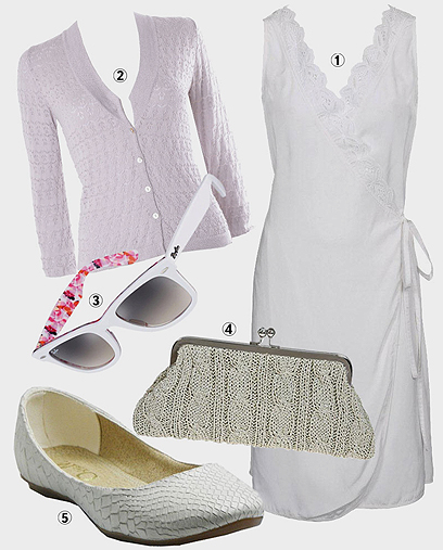 למי שרוצה ללכת על בטוח, ע"ע לוק נשי, הכי פשוט ללכת על שמלה לבנה ולהתאים אותה לנעליים שטוחות. את הטוויסט אפשר לתת בגזרת התיק שיהיה בצבע אבן או אוף ווייט ולא מומלץ להגזים עם התכשיטים. השמלה גם ככה עושה את העבודה. הערבים מתקררים (בכל זאת, סוג של סתיו) ולכן אני ממליץ כאן על קרדיגן נאה (ראו בצד עוד רעיונות לעליוניות).
