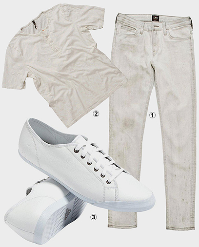 1. ג'ינס: לי, 549 שקל; 2. חולצה: נודי ג'ינס לסטורי, 249 שקל; 3. סניקרס: לה קוק ספורטיף, 349 שקל