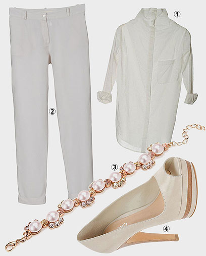 1. חולצת אובר סייז: צ'יפ מאנדיי לבל אנד סו, 319 שקל; 2. מכנסיים: אמריקן וינטג', 285 שקל; 3. צמיד: אבגד, 175 שקל; 4. עקבים: אלדו, 400 שקל (אחרי הנחה)