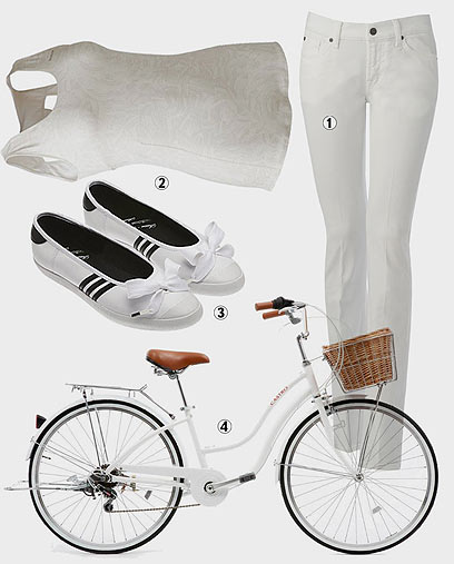 1. ג'ינס: סבן-7, 1,300 שקל; 2. גופיה: ריבוק, 199 שקל; 3. נעלי סירה: אדידס אוריג'ינלס, 299 שקל; 4. אופניים: קסטרו, 1,300 שקל