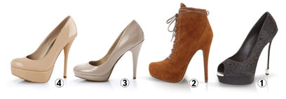 1. דיסקו רוסו, 719 שקל; 2. פיילס, 220 שקל; 3. קסטרו, 993 שקל; 4. אלדו, 449 שקל